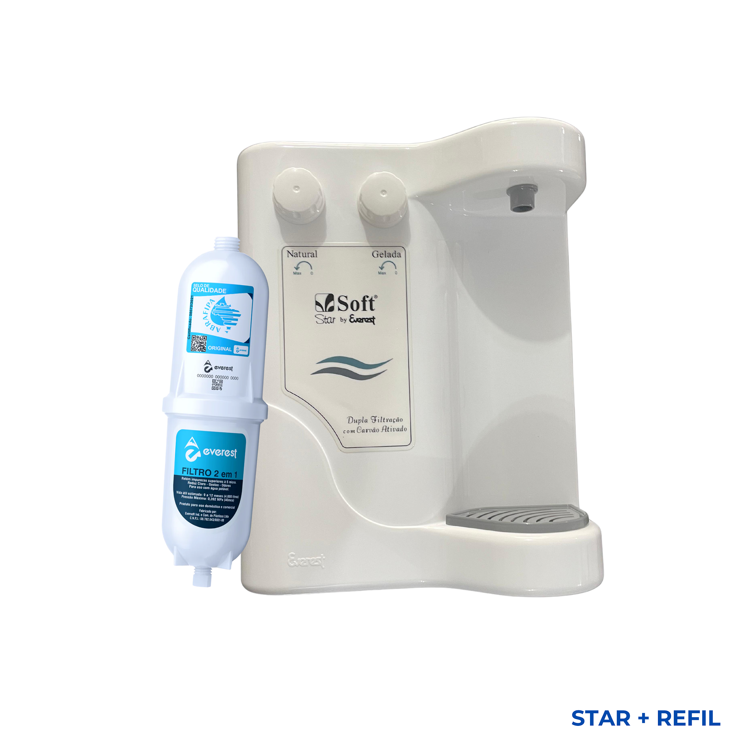 O refil original Everest assegura água pura e saudável, mantendo a eficiência da filtragem e o padrão de qualidade do fabricante. Compatível exclusivamente com o Purificador Soft STAR – modelo antigo, este kit oferece praticidade, estética e funcionalidade em um único produto.
